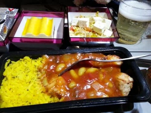 ラウンジでゆーっくりして、さあ、ドーハまで5時間のフライトです。時間帯が時間帯だけに寝るだけです。ローマからもA320の座席3-3の小さな飛行機。 やはりテイクオフから1時間ほどして食事タイム。 チキンのエスニックな食事。ドリンクはシャンパン…